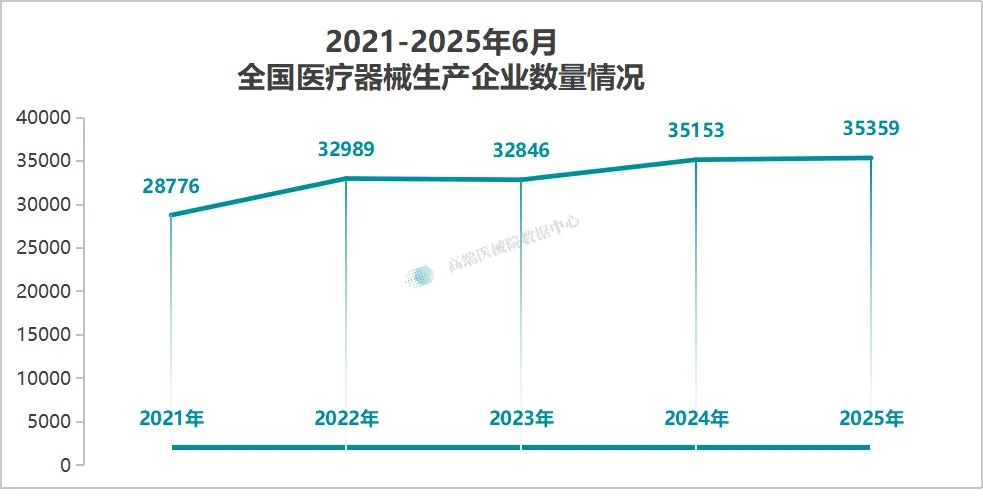 据高端医械院数据中心统计,截至2025年6月30日,全国境内医疗器械生产企业达35359家,较2024年底(35153家)增长5.86%。