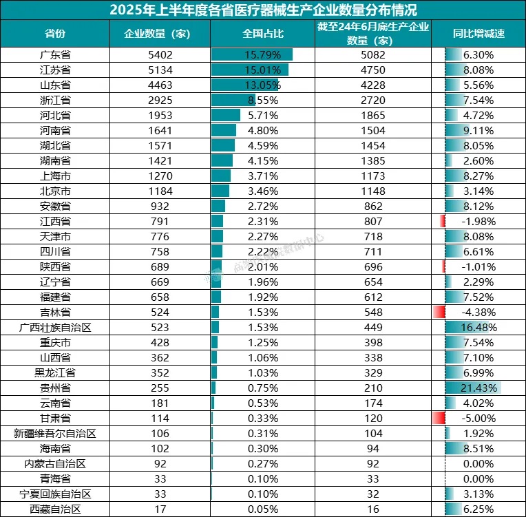 总体来看,2025 年上半年全国医疗器械生产企业的发展呈现出规模增长、区域分化的特点。