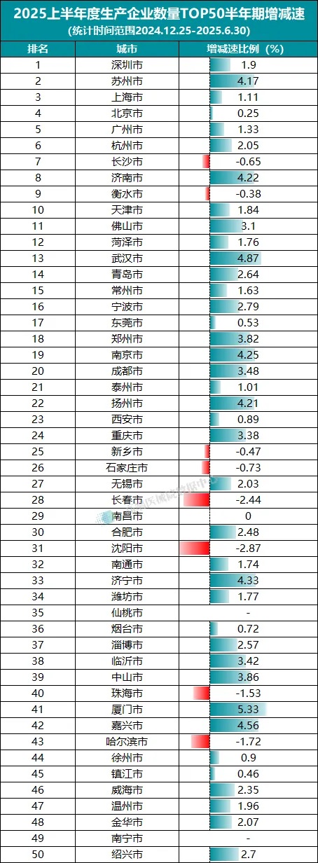 通过2025年上半年度TOP50城市与2024年对应城市的企业数量增减速的对比可以发现,除仙桃市外,增速最快的城市为厦门(5.33%),而降幅最大的城市则为沈阳市(-2.87%)、长春市(2.44%)。