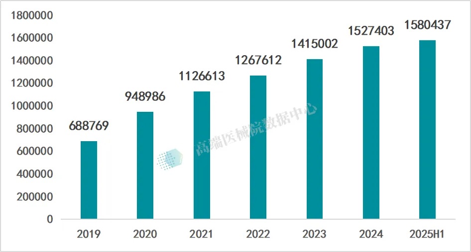 据高端医械院数据中心统计,截至2025年6月,全国境内医疗器械经营企业达1580437家,较2024年底(1527403家)增长约3.5%。2019年至2025年上半年,全国境内医疗器械经营企业整体呈增长趋势。