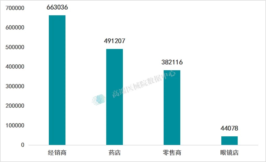 截至2025年6月,全国医疗器械经营企业类型有经销商(663036家,占41.95%)、药店(491207家,占31.08%)、零售商(382116家,占24.18%)、眼镜店(44078家,占2.79%)。