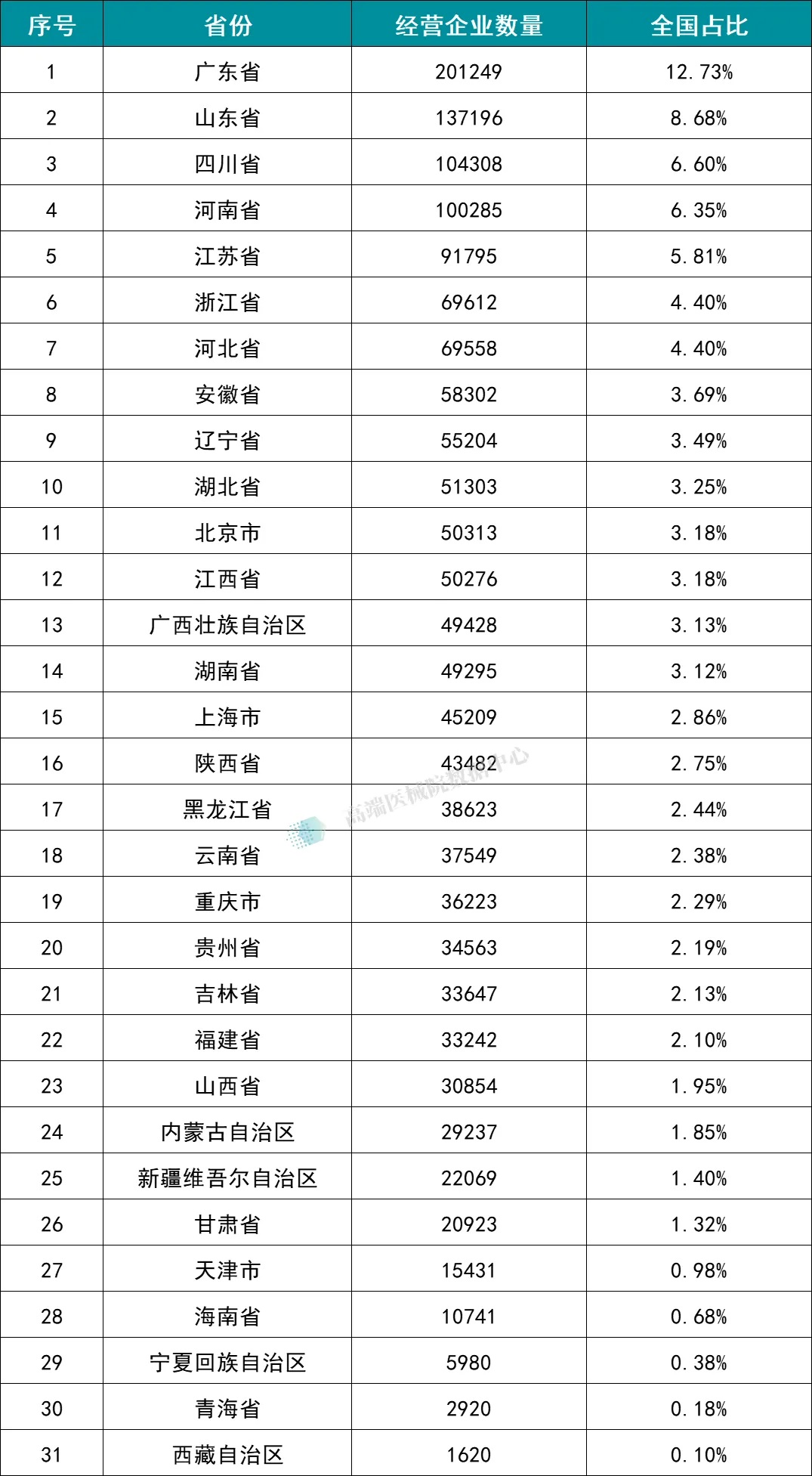 可经营Ⅱ类产品企业数量排名前三的省份分别为广东省(194195家)、山东省(129384家)、四川省(99167家),全国占比分别为13.22%、8.81%、6.75%。