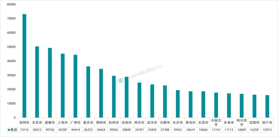 从城市分布上看,深圳市以73115家位列全国医疗器械经营企业数量排名第一,北京市(50313家)、成都市(49250家)分别位列第二、第三。其后全国排名前十的城市分别是 上海市、广州市、重庆市、郑州市以及济南市。