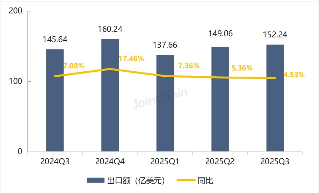据众成数科统计,2025年第三季度我国医疗器械出口额为152.24亿美元,同比增长4.53%。从月度数据看,7月至9月出口额均稳定在50亿美元以上,同比增速7月达7.18%,8月有所回落,9月小幅回升。