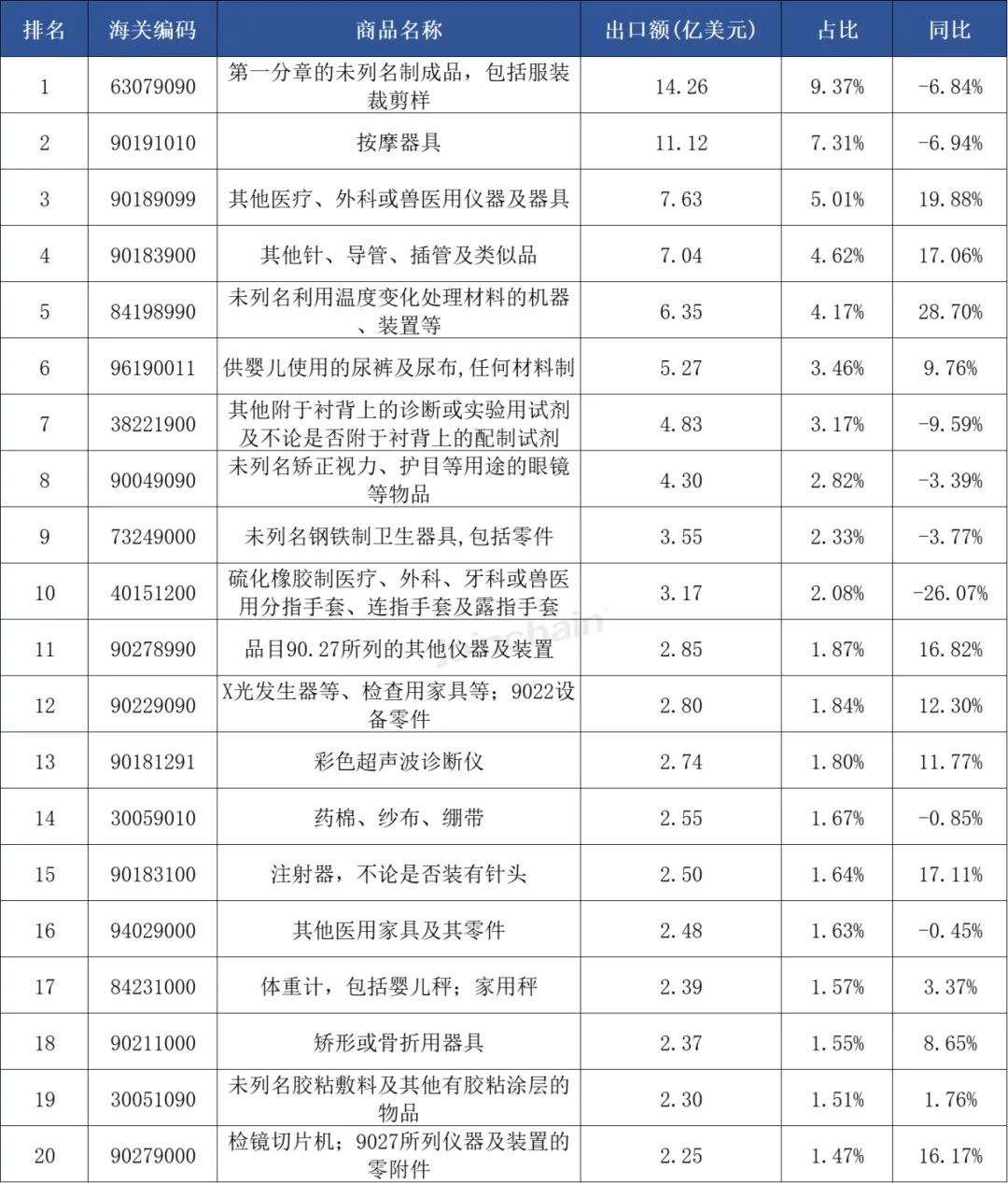 表 2 2025年第三季度中国医疗器械各商品出口额及同比情况(TOP20) ![]() 数据来源:众成数科