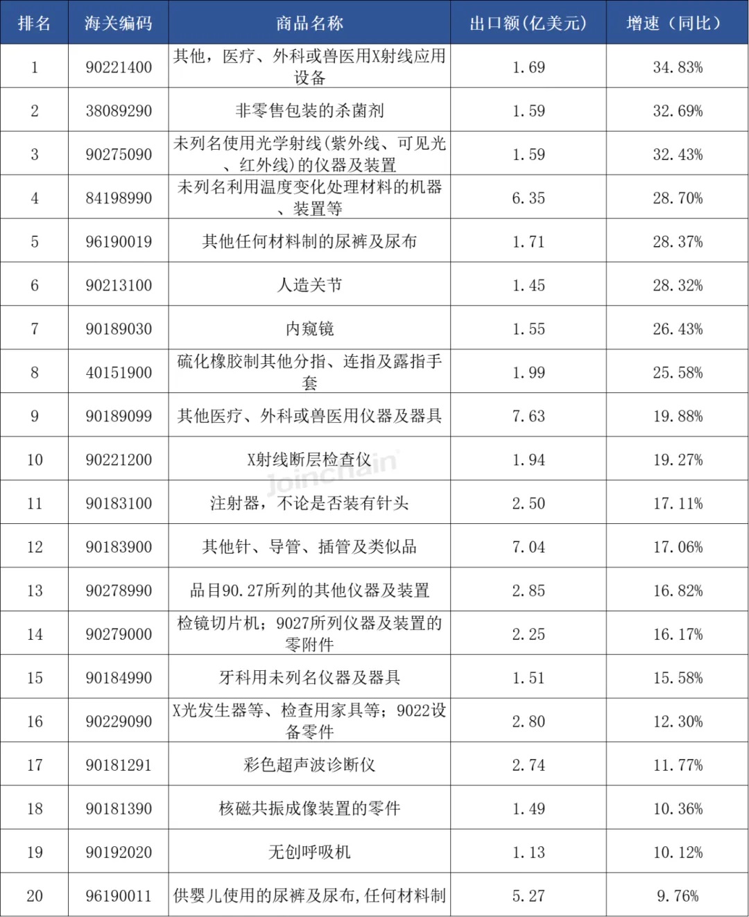 表 3 2025年第三季度中国医疗器械各商品出口额增速排行(TOP20) ![]() 数据来源:众成数科