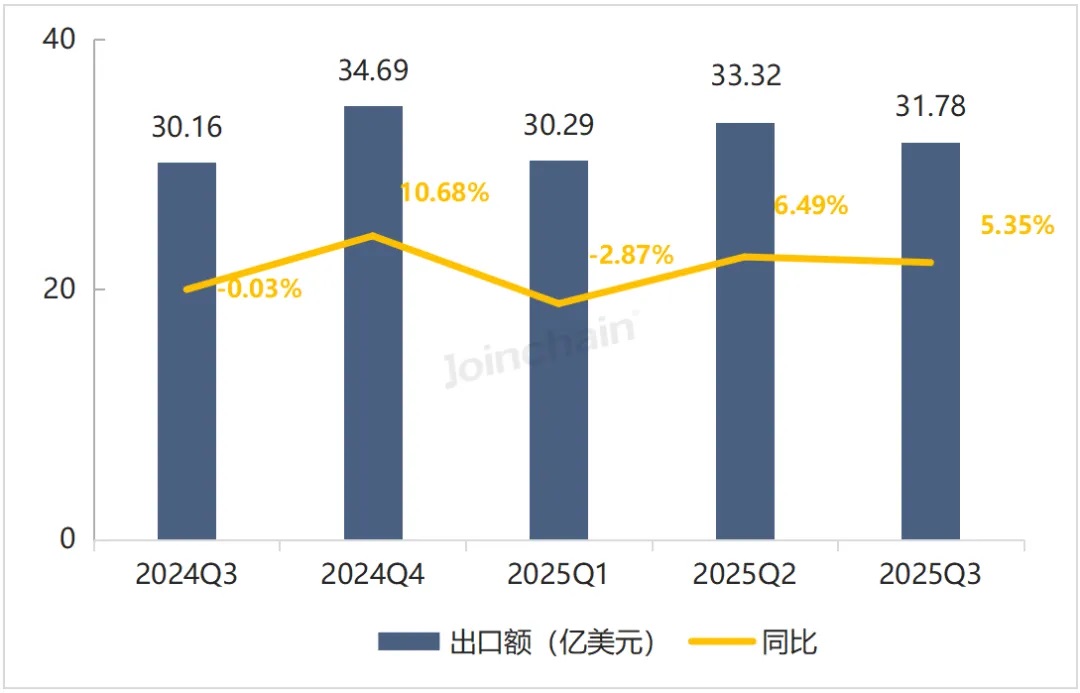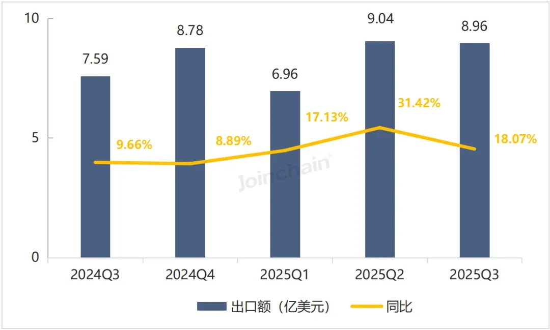 图 1 2024Q3-2025Q3我国医疗器械出口额及同比增长率