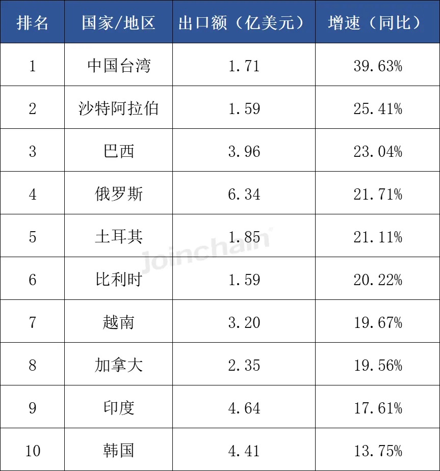 从出口额增速(注:只统计2025年第三季度出口额超过1亿美元的国家/地区)来看,2025年第三季度我国医疗器械对多个国家和地区的出口额均实现同比正增长,其中排在前三位的依次是中国台湾(39.63%)、沙特阿拉伯(25.41%)和巴西(23.04%)。