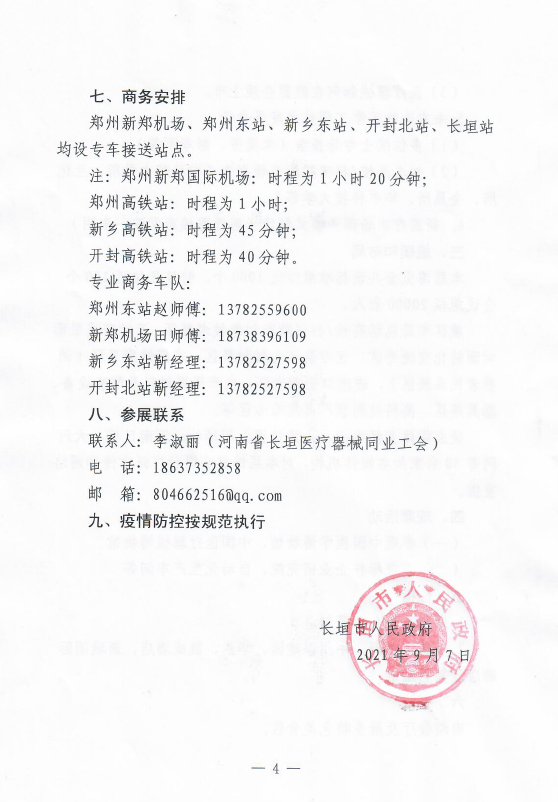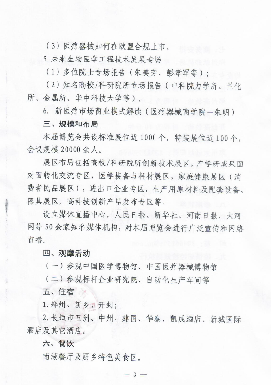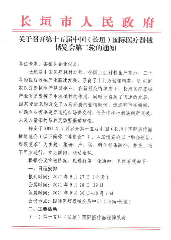 各会员单位: 长垣市人民政府拟定于2021年9月28-30日召开以“融合创新、智领变革”为主题的第十五届中国(长垣)国际医疗器械博览会(以下简称“博览会”)。这次博览会的展商涉及医疗器械原材料、设备、生产线等及配套企业,同时还将举办医保政策、供应链管理、医院精细化管理、质量临床注册审评、 未来生物医学工程技术发展等专场论坛。博览会相关详情参见附件1。 这将是医疗器械全产业链的一次交流机会,欢迎各会员单位前往参观。博览会交通位置参见附件2。 由于观展人员较多,请提前预订酒店房间!预订房间时报“驼人博览会”即可享受酒店协议价格,费用自理。 推荐入住酒店:驼人产业新城人才公寓酒店(距离会展中心步行5分钟) 收费标准:128元/晚(含早),可提供标间/单间 早餐地点:驼人集团南湖餐厅一楼,凭餐券用餐 联系人:林云霞,18638300925/0373-8032666 位置(高德导航):驼人产业新城人才公寓 另请观展人员严格按照国家常态化防控的总体要求以及长垣市和博览会疫情防控有关要求,观展及参加会议等活动期间保持社交距离,科学佩戴口罩。酒店办理入住时,请配合酒店查询行程码、健康码等疫情防控有关工作。中、高风险等疫情重点地区人员请勿参加此次活动。