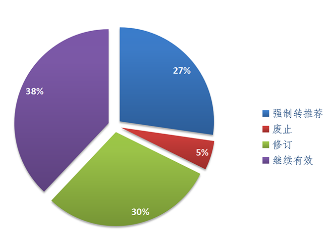 根据《医疗器械强制性标准优化工作方案》要求,组织完成396项医疗器械强制性标准和62个在研强制性标准项目优化评估。优化评估结果为:458项医疗器械强制性标准和在研项目中,建议转推荐125项、废止23项、修订136项、继续有效174项(见图2)。