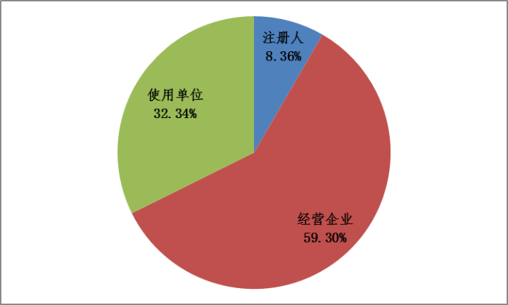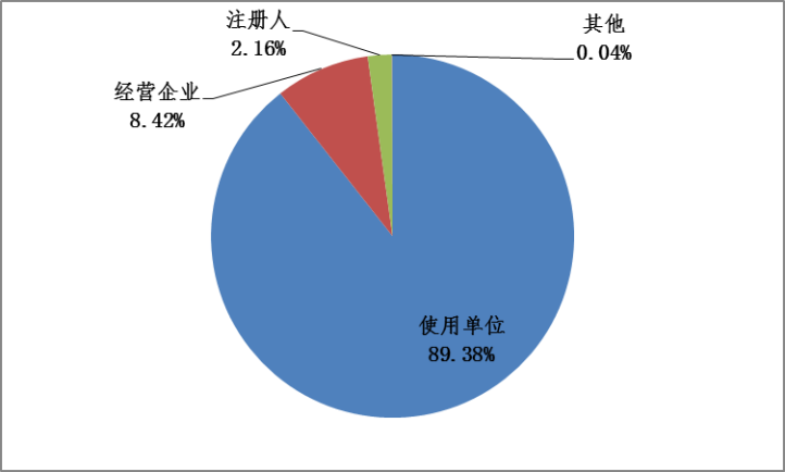 截至2023年12月31日,在国家医疗器械不良事件监测信息系统中注册的基层用户(包括注册人和备案人(以下简称注册人)、经营企业和使用单位)共415,158家,比上年增长4.43%。其中注册人34,711家,比上年增长9.68%,占用户总数的8.36%;经营企业246,184家,比上年增长4.83%,占用户总数的59.30%;使用单位134,263家,比上年增长2.43%,占用户总数的32.34%(图2)。