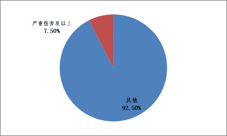2023年,国家药品不良反应监测中心收到的医疗器械不良事件报告中,伤害程度为严重伤害及以上的报告65018份,占报告总数的7.50%;伤害程度为其他的报告802,222份,占报告总数的92.50%(图4)。