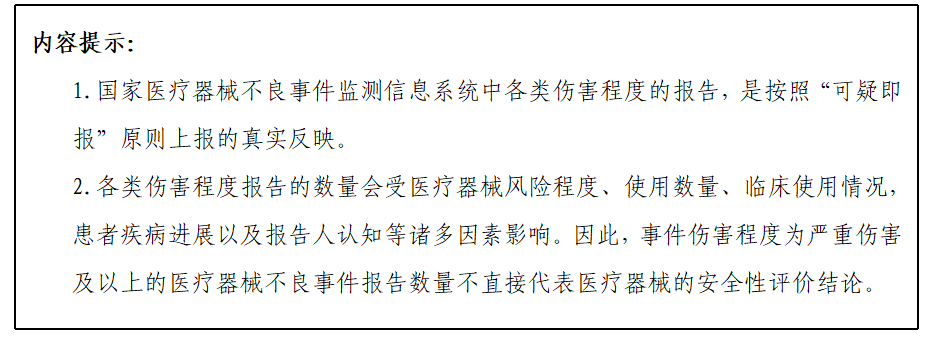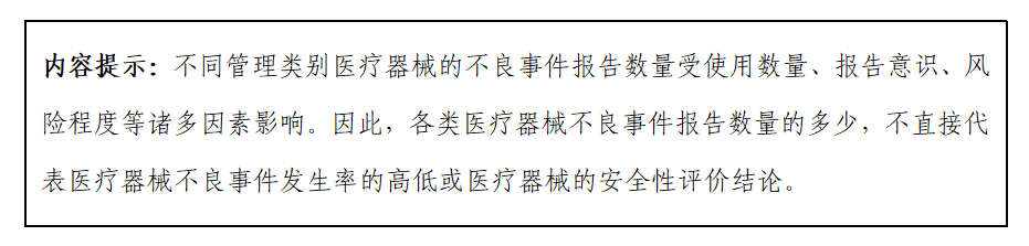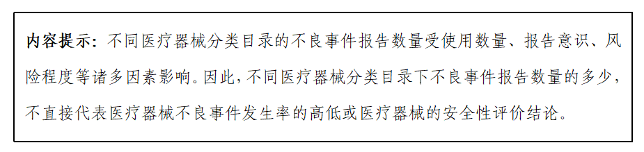 (二)不同医疗器械的不良事件报告数量受使用数量、风险程度、报告意识等诸多因素影响,因此报告数量的多少不直接代表医疗器械不良事件发生率的高低或者风险严重程度。