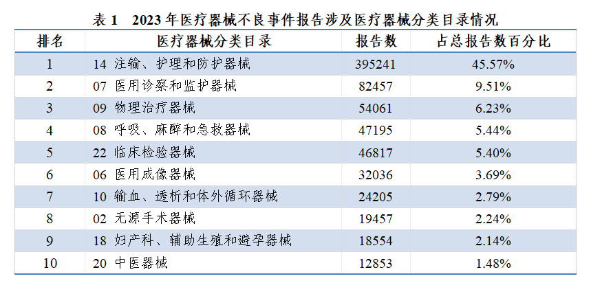 2023年,国家药品不良反应监测中心收到的医疗器械不良事件报告涉及了医疗器械分类目录中的所有类别。其中,报告数量排名前十位的医疗器械类别见表1。
