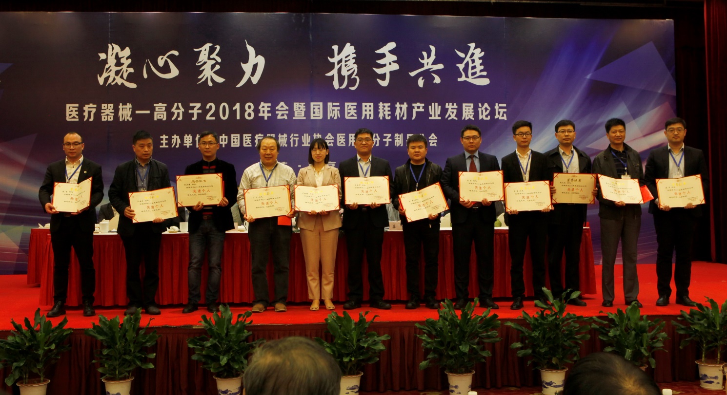 高分子分会积极响应国家关于标准化改革的政策,两年来,共组织专家和会员单位编写并发布了18份团体标准和 管理规范,是中国医疗器械行业协会唯一一家发布团体标准的分支机构。为鼓励更多的企业和个人参与到标准化工作 中来,会上表彰了几年来为分会标准化工作做出突出贡献的企业6家,并授予他们“标准化先进企业”牌匾。先进企 业代表上台领奖并合影留念。
