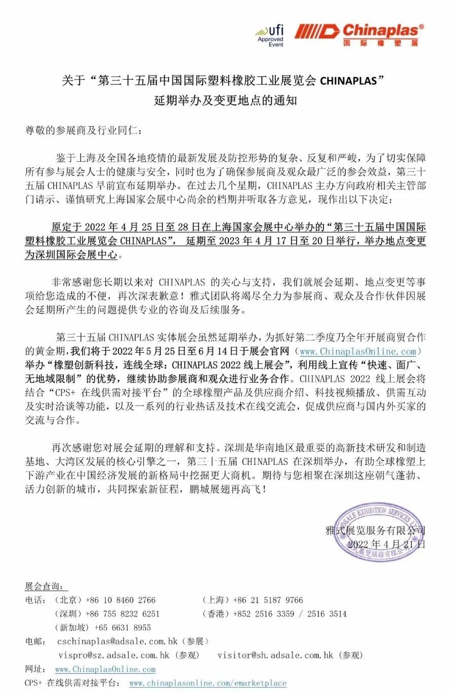 原定于2022年4月25日至28日在上海国家会展中心举办的“第三十五届中国国际塑料橡胶工业展览会 CHINAPLAS”,延期至2023年4月17日至20日举行,举办地点变更为深圳国际会展中心。