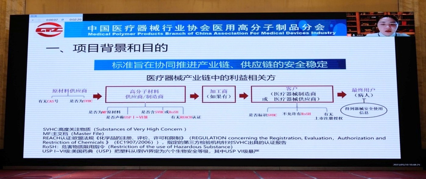 提升产业链供应链韧性和安全水平,需要产业链供应链相关方的集体行动。因此,分会组织供应链上、下游合作伙伴,共同制定并贯彻协会发布的团体标准《医用高分子材料控制指南》,以树立安全供应理念,建立契约化安全供应机制,推动医用高分子材料供应链强链、固链。会上,分会专家、中石化(北京)化工研究院有限公司研究员唐毓婧博士因故未能亲临现场与会,只能通过视频形式对该标准进行了解读。